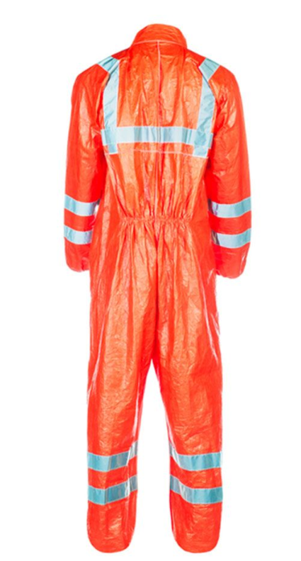 De beschermende overall is voorzien van een kraag voor extra bescherming en heeft een ergonomisch en beschermend ontwerp dat comfort en veiligheid combineert. De externe naden zorgen voor extra duurzaamheid en voorkomen het binnendringen van schadelijke stoffen. Elastische boorden aan armen en benen zorgen voor een veilige pasvorm, terwijl de ingelijmde elastische taille extra bescherming en bewegingsvrijheid biedt.