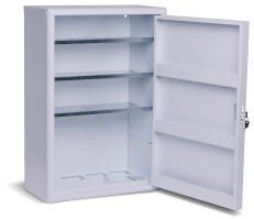 Armoire métallique en acier au carbone blanc PO2 émaillée avec de la poudre époxy polyester, avec des coins arrondis, 3 étagères métalliques internes, 2 petites étagères sur la porte et une serrure à clé.