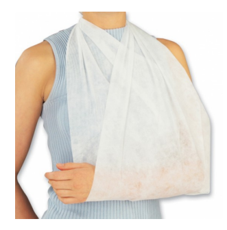 Un bandage triangulaire de dimensions 96 x 96 x 136 cm, fabriqué en matériau non tissé. Il est utilisé pour immobiliser le bras.