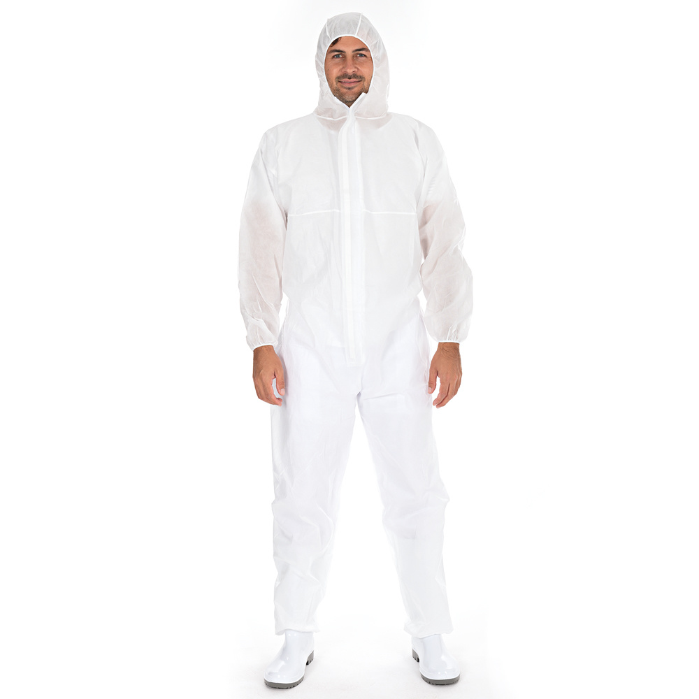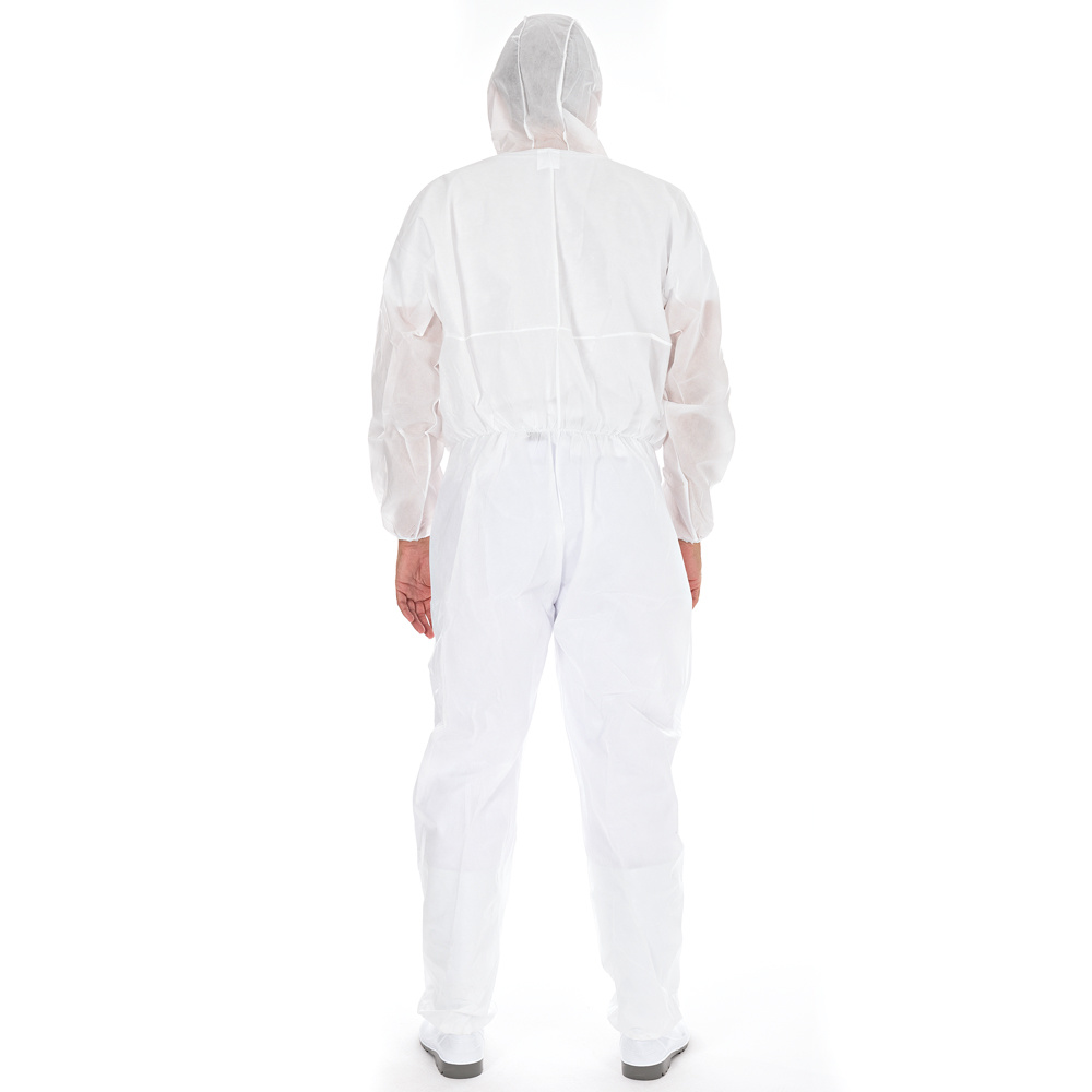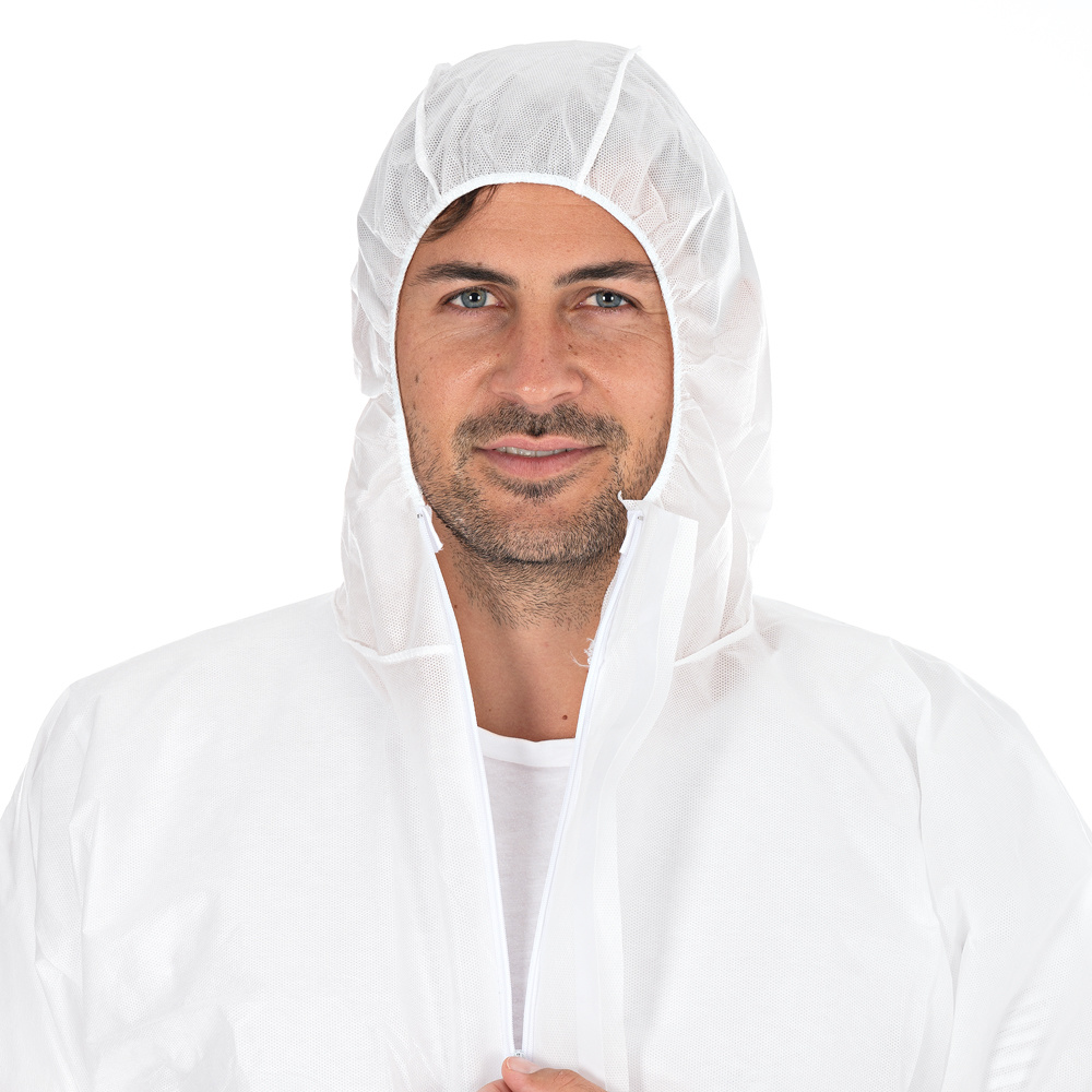 Les combinaisons sont fabriquées en SMS et répondent aux exigences des normes EN 13982-1 type 5 et EN 13034 type 6, ce qui signifie qu'elles sont résistantes aux projections et offrent une protection contre les produits chimiques liquides et les particules solides. Les combinaisons sont utilisées dans les cuisines, les laboratoires, la médecine, la pharmacie ou lors de travaux de nettoyage comme protection individuelle. Elles protègent le porteur contre les risques biologiques et chimiques. Le matériau SMS est respirant et confortable à porter, même en cas d'utilisation prolongée.