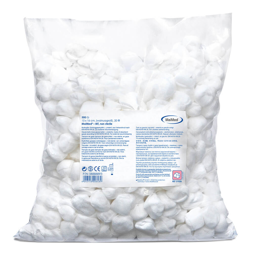 • Compresses de gaze prêtes à l'emploi fabriquées à partir d'une gaze blanche.