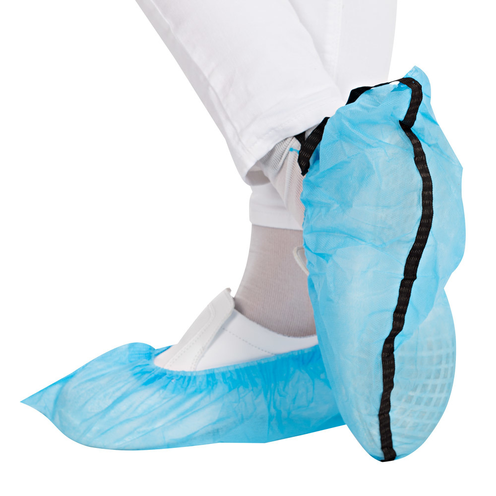 Les surchaussures « antistatiques » sont spécialement conçues pour être utilisées avec la machine à surchaussures Hygomat. Elles sont dotées d'une bande de contact noire intégrée qui sert à mettre le corps à la terre. Pour cela, la bande doit être en contact avec la peau de l'utilisateur afin d'obtenir l'effet antistatique. Les surchaussures conviennent à toutes les chaussures et à toutes les pointures. Elles sont également adaptées au contact alimentaire, mais ne doivent pas entrer en contact avec des aliments acides.