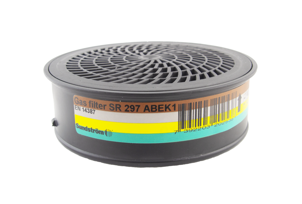 Le filtre à gaz SR 297, classe 1, est conçu pour être utilisé avec les demi-masques et les masques complets Sundström. Le filtre est de type ABEK et offre une protection contre les types de gaz et de vapeurs suivants : Le type A protège contre les gaz et vapeurs organiques, tels que les solvants, dont le point d'ébullition est supérieur à +65 °C. Le type B protège contre les gaz et vapeurs inorganiques, tels que le chlore, l'hydrogène sulfuré et le cyanure d'hydrogène. Le type E protège contre les gaz et vapeurs acides, tels que le dioxyde de soufre et l'hydrogène fluoré. Le type K protège contre l'ammoniac et certaines amines, telles que l'éthylènediamine. Le filtre à gaz peut être facilement combiné avec le filtre à particules SR 510 P3 R afin d'offrir également une protection contre les aérosols (particules), par exemple lors de la pulvérisation de peinture.
