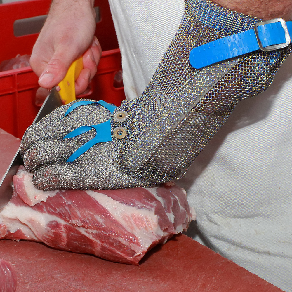 Le gant en cotte de mailles métallique est composé d'anneaux en acier inoxydable d'un diamètre de 4 mm. Il peut être ajusté avec précision grâce à la technique éprouvée du bouton-pression. Il est également possible de retirer rapidement le gant. Le gant en treillis métallique peut être facilement changé de la « main gauche » à la « main droite ». Il est hygiénique, léger et confortable à porter. Ce gant respectueux de l'environnement est particulièrement adapté à une utilisation dans la production alimentaire.