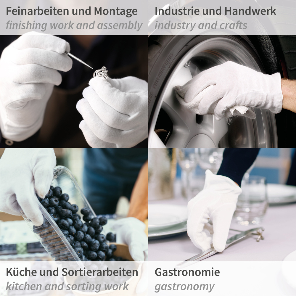 Avec leur couleur blanc éclatant, leur coupe précise et leur haute qualité, les gants en coton Blanc impressionnent depuis des années nos clients issus des secteurs les plus divers. Ces gants en coton de poids moyen bénéficient d'une finition particulièrement soignée et de grande qualité. Les doigts superposés et le pouce inséré garantissent un ajustement anatomique précis, ce qui permet aux gants de s'adapter parfaitement à vos mains et de suivre leurs mouvements.