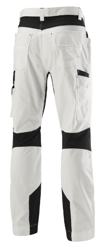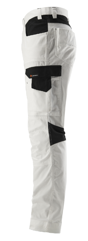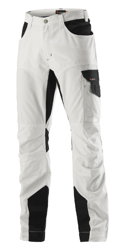 Poches et supports : deux poches avant. Poches arrière plaquées. Poche pour mètre pliant à droite avec poches supplémentaires. Poche sur la jambe gauche avec rabat et poche pour téléphone. Poches sur les genoux.