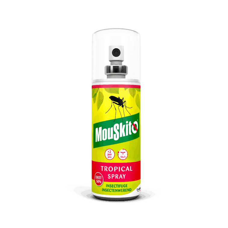 Spray anti-insectes contre les moustiques, les mouches et les tiques. Le spray Mouskito® Tropical protège pendant 10 heures contre les moustiques et pendant 8 heures contre les mouches et les tiques dans les régions tropicales. Efficace contre le moustique Anopheles (vecteur du paludisme) pendant 10 heures. L'efficacité contre la mouche tsé-tsé n'est pas prouvée.