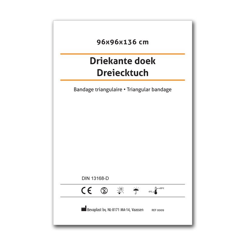 Tissu triangulaire non tissé. Le tissu triangulaire peut servir de bandage ou remplacer un bandage idéal. Emballé à l'unité. Dimensions : 96 x 96 x 136 cm.