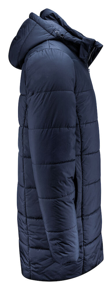 Veste matelassée longue avec fermeture éclair à double sens. Capuche amovible. La capuche est ajustable à l'aide de cordons élastiques. Col et poignets côtelés. Poches latérales zippées, poche intérieure zippée. Intérieur des poches en tricot brossé pour garder les mains au chaud par temps froid. Cet article est emballé dans un sac en polyéthylène compostable.